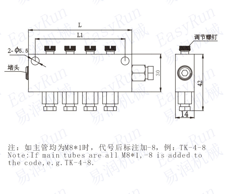 TK可調(diào)型分配器是與間歇式工作或連續(xù)工作的稀油潤滑泵配套使用。通過調(diào)節(jié)出油孔截面積大小來任意調(diào)節(jié)出油口的出油量。 主要用于潤滑點需油量無準確要求的各小型機械設備。